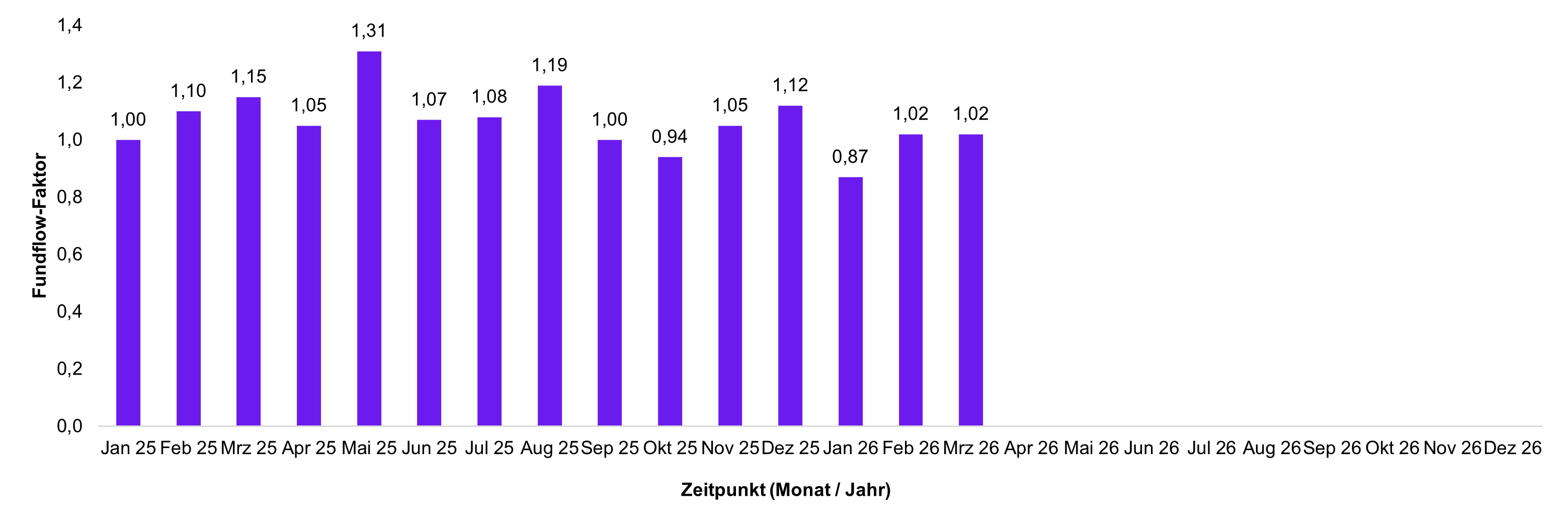 Veränderungen der Mittelzuflüsse und Mittelabflüsse werden über den Fundflow-Faktor ausgedrückt. Dabei werden die monatlichen Mittelzuflüsse des Berichtszeitraums in Relation zu den monatlichen Mittelabflüssen gesetzt. Bei einem Fundflow-Faktor über eins überwiegen die Mittelzuflüsse, bei einem Fundflow-Faktor unter eins die Mittelabflüsse.
