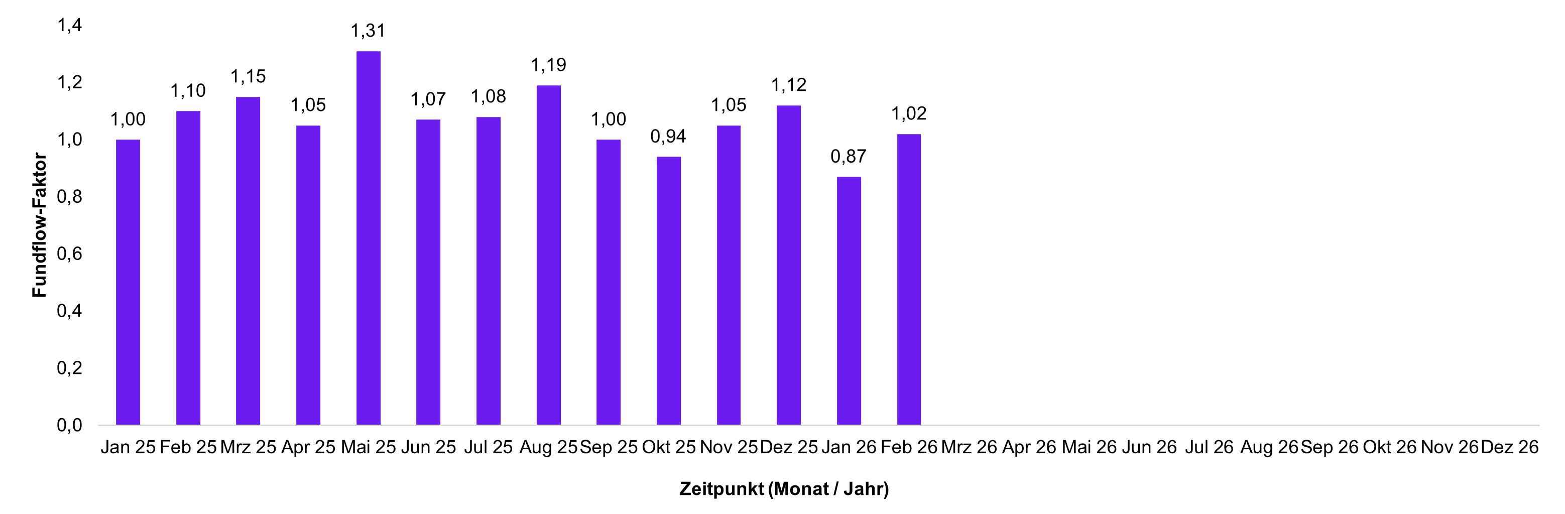 Veränderungen der Mittelzuflüsse und Mittelabflüsse werden über den Fundflow-Faktor ausgedrückt. Dabei werden die monatlichen Mittelzuflüsse des Berichtszeitraums in Relation zu den monatlichen Mittelabflüssen gesetzt. Bei einem Fundflow-Faktor über eins überwiegen die Mittelzuflüsse, bei einem Fundflow-Faktor unter eins die Mittelabflüsse.