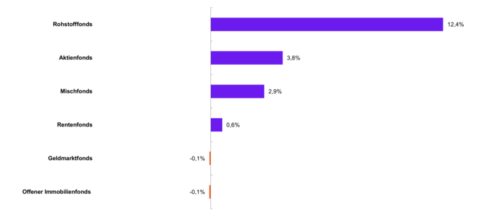 Im Januar entwickelten sich die unterschiedlichen Fondstypen spürbar positiver als im Vormonat. Besonders Rohstofffonds stachen mit einem kräftigen Wertzuwachs von 12,4 % hervor und erzielten damit die mit Abstand stärkste Entwicklung. Auch Aktienfonds (3,8 %) und Mischfonds (2,9 %) verzeichneten eine spürbare Erholung. Rentenfonds entwickelten sich moderat, erzielten jedoch einen leichten Anstieg auf 0,6 %. Geldmarktfonds und offene Immobilienfonds blieben nahezu unverändert und zeigten sich mit -0,1 % stabil. Insgesamt war der Januar damit von einer klaren positiven Tendenz geprägt.