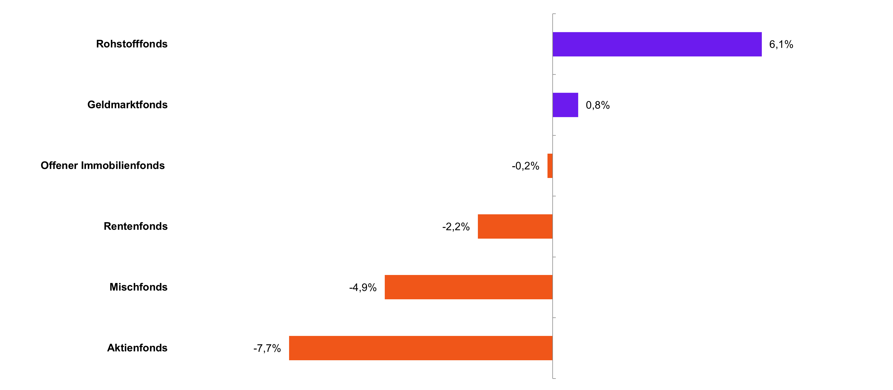 Im aktuellen Monat zeigte sich in der Performance der verschiedenen Fondskategorien ein deutlich verändertes Bild. Während Rohstofffonds mit einer kräftigen Performance von 6,1% klar zulegen konnten, entwickelten sich die übrigen Segmente überwiegend rückläufig. Geldmarktfonds verzeichneten sich mit 0,8% immerhin einen moderaten Anstieg, während offene Immobilienfonds mit -0,2% leicht nachgaben. Deutlich schwächer präsentierten sich hingegen die klassischen Anlageklassen: Rentenfonds (-2,2%) und Mischfonds (-4,9%) rutschten spürbar ins Minus. Die stärksten Verluste verzeichneten Aktienfonds, die auf -7,7% zurückfielen.
