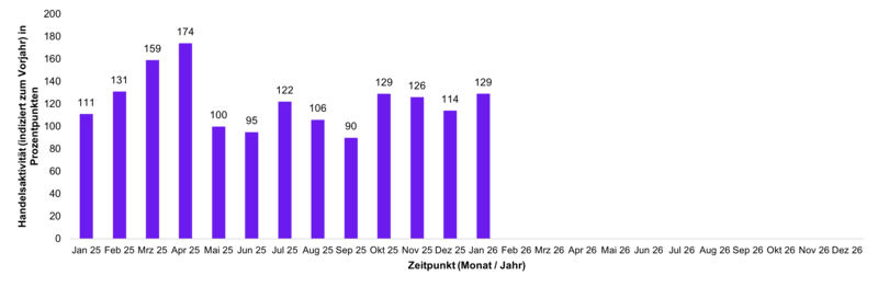 Die Handelsaktivität basiert auf dem Handelsvolumen und lässt unmittelbare Rückschlüsse auf den aktuellen Jahrestrend im Handel mit ETFs bei Kunden der FNZ Bank zu. Ein Wert von über 100 steht für eine überdurchschnittliche Handelsaktivität der Kunden im Vergleich zum mittleren monatlichen Handelsvolumen des Vorjahres; ein Stand unter 100 zeigt eine unterdurchschnittliche Handelsaktivität an.