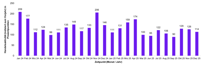 Die Handelsaktivität basiert auf dem Handelsvolumen und lässt unmittelbare Rückschlüsse auf den aktuellen Jahrestrend im Handel mit ETFs bei Kunden der FNZ Bank zu. Ein Wert von über 100 steht für eine überdurchschnittliche Handelsaktivität der Kunden im Vergleich zum mittleren monatlichen Handelsvolumen des Vorjahres; ein Stand unter 100 zeigt eine unterdurchschnittliche Handelsaktivität an.